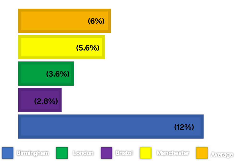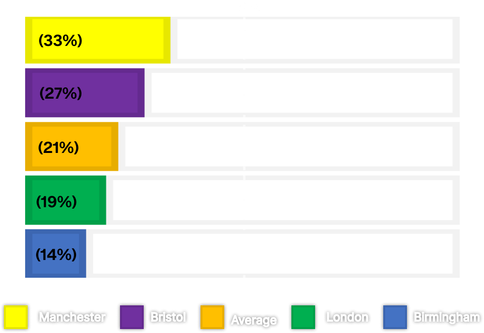 We calculated the percentage of WGNC artists on lineups across Birmingham, London, Manchester and Bristol.